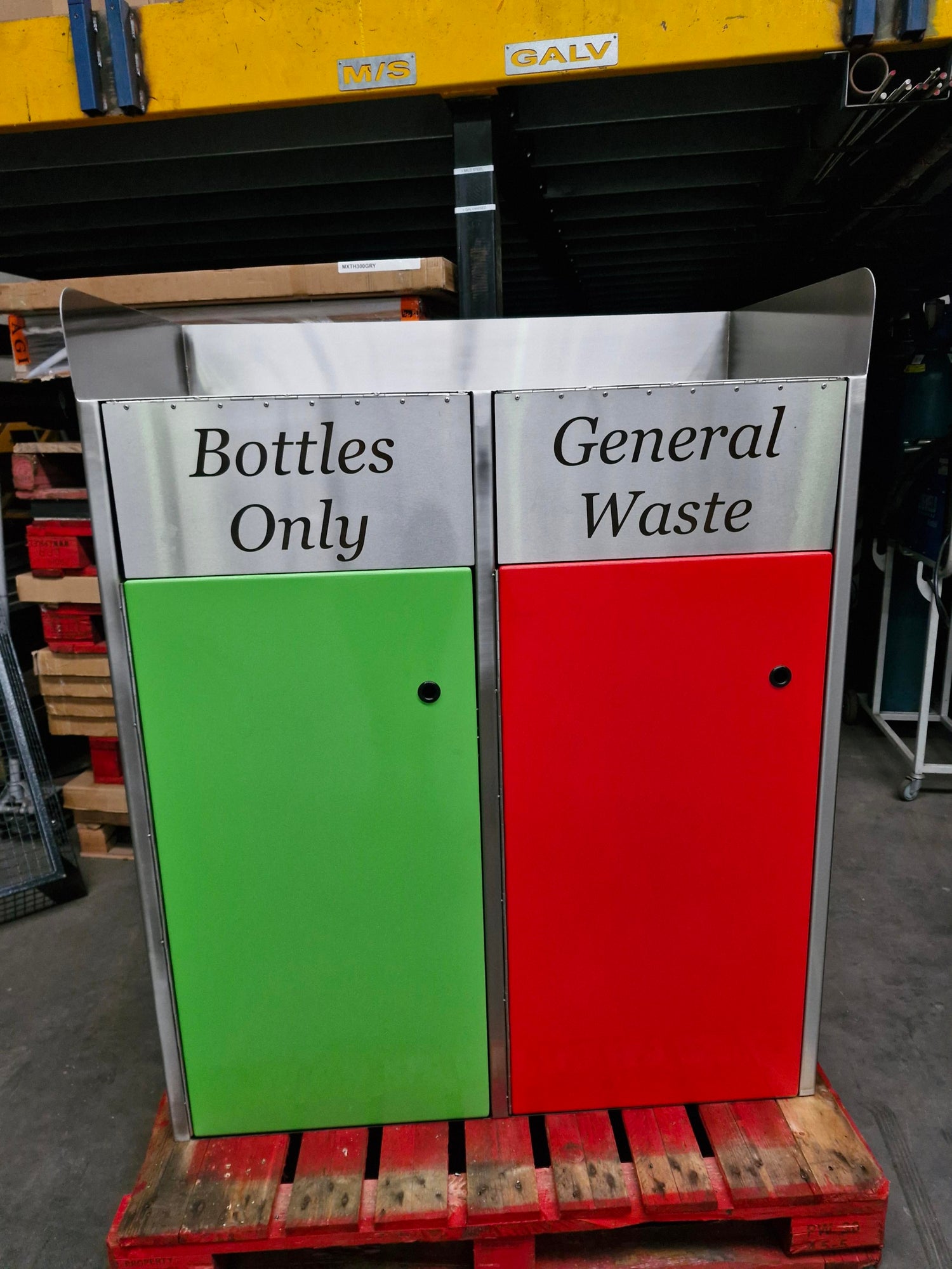 This custom double-flap waste bin was designed specifically for a busy restaurant environment, combining durability with a sleek, professional look. The unit features powder-coated doors, laser-etched wording on the flaps for clear waste separation, and a top tray section for convenient food tray storage.