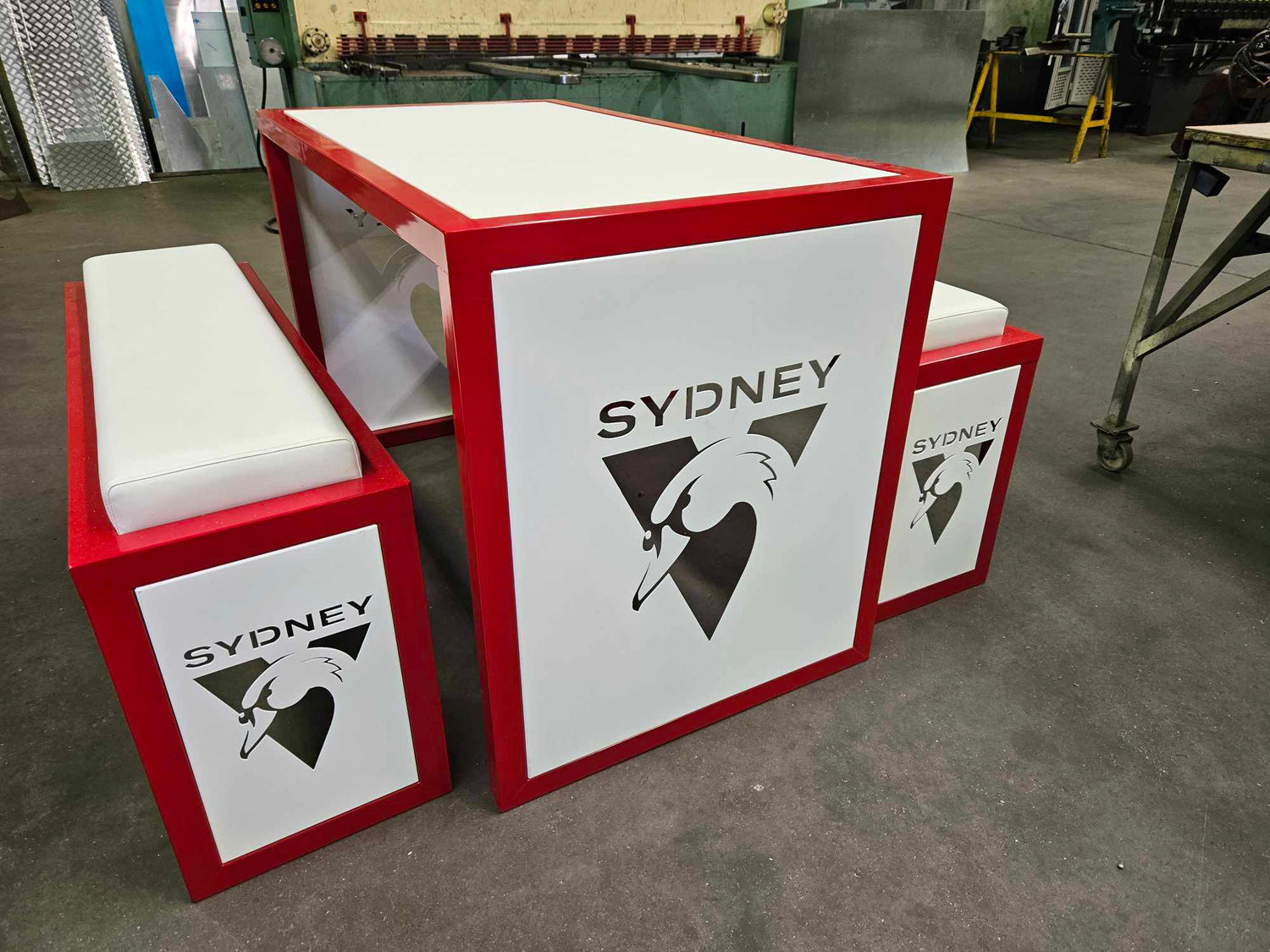 This piece from our Frame Collection showcases a bold, modern design with clean lines and durable construction. Featuring a powder-coated steel frame with inset panels, this custom table and bench set was created with a Sydney Swans theme, incorporating precision-cut graphics for a striking, high-contrast finish.